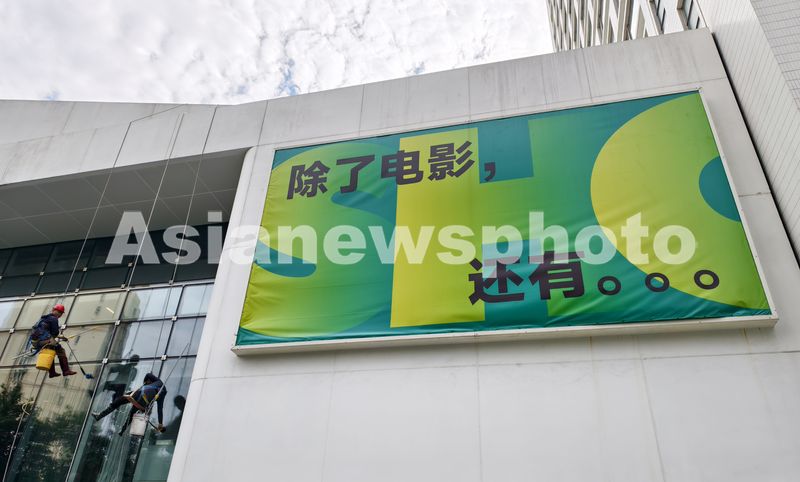 图片说明:2025年6月5日,上海国际电影节主会场上海影城外,清洁工人正在为这座光影殿堂建筑做最后的外墙清洗工作。