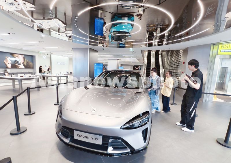 2025年6月5日,上海,钛金属版小米YU7新能源电动汽车亮相小米之家旗舰店,作为小米汽车旗下首款豪华高性能SUV电动车,银色酷炫造型吸引消费者关注。