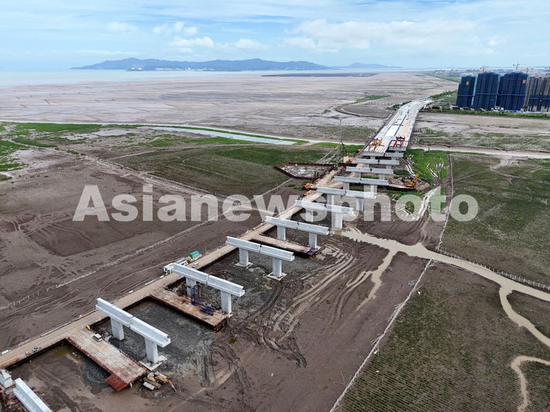 2025年6月10日,浙江省温州市乐清湾退潮之后,滩涂区域呈现出一幅壮观的施工景象,滨海大道桥梁建设现场桥墩矗立,桥梁架设施工正有序推进。