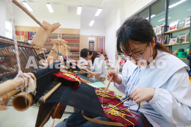 2025年6月12日,重庆旅游职业学院学生编织国家级非遗项目土家织锦西兰卡普。