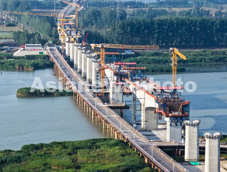 图片说明:2025年6月16日,江苏省淮安市,宁淮城际铁路洪泽至金湖双线特大桥跨淮河入江水道段施工现场,建设者们正在进行连续梁节段施工。