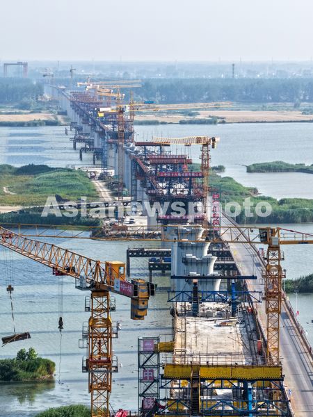 图片说明:2025年6月16日,江苏省淮安市,宁淮城际铁路洪泽至金湖双线特大桥跨淮河入江水道段施工现场,建设者们正在进行连续梁节段施工。