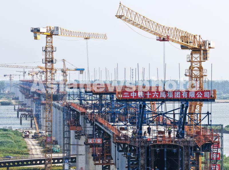 图片说明:2025年6月16日,江苏省淮安市,宁淮城际铁路洪泽至金湖双线特大桥跨淮河入江水道段施工现场,建设者们正在进行连续梁节段施工。