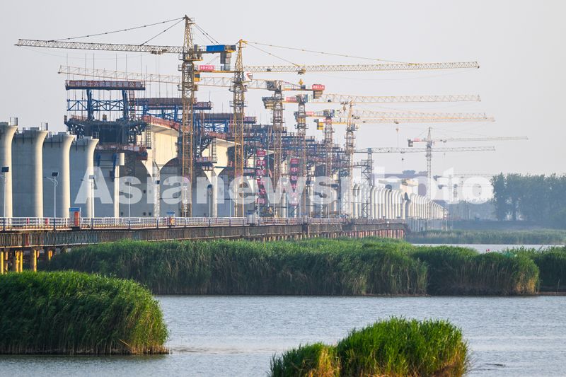 图片说明:2025年6月16日,江苏省淮安市,宁淮城际铁路洪泽至金湖双线特大桥跨淮河入江水道段施工现场,建设者们正在进行连续梁节段施工。
