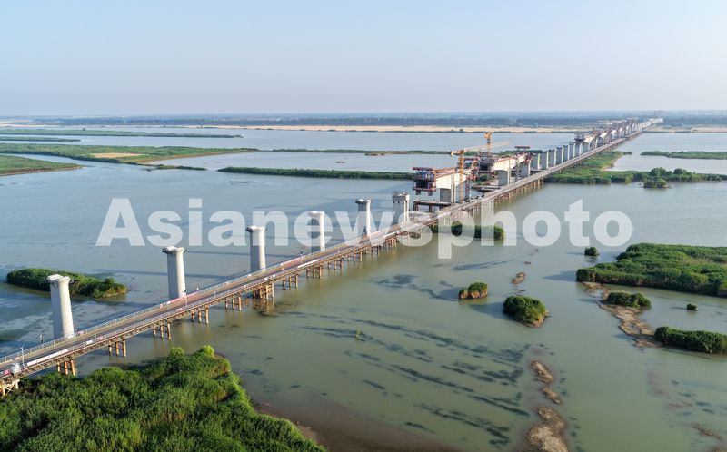 图片说明:2025年6月16日,江苏省淮安市,宁淮城际铁路洪泽至金湖双线特大桥跨淮河入江水道段施工现场,建设者们正在进行连续梁节段施工。
