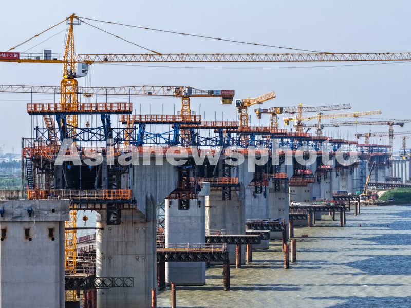 图片说明:2025年6月16日,江苏省淮安市,宁淮城际铁路洪泽至金湖双线特大桥跨淮河入江水道段施工现场,建设者们正在进行连续梁节段施工。