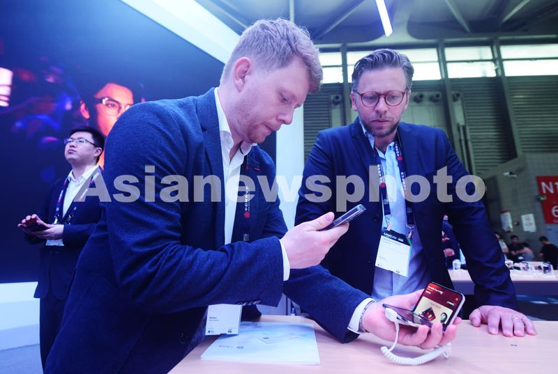 2025年6月18日,外国观众在上海举办的2025世界移动通信大会上参观华为的折叠屏手机 Pura X 。