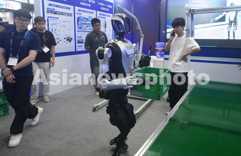 2025年6月18日,观众在上海举办的2025世界移动通信大会上参观看乐趣人形机器人进行搬运货物的演示。