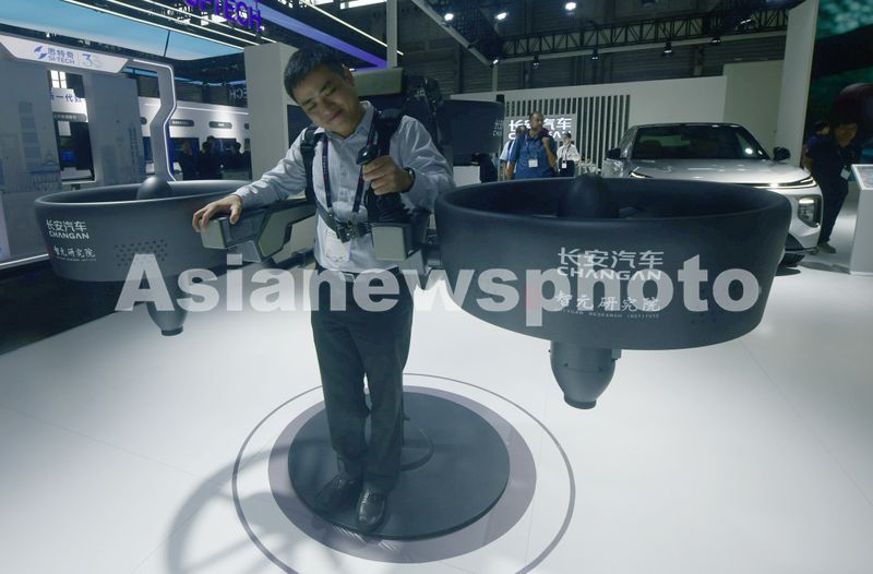 2025年6月18日,观众在上海举办的2025世界移动通信大会上,体验长安汽车推出的可进行空中飞行的飞行书包。