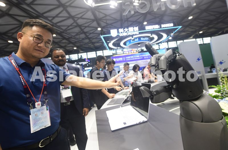 2025年6月18日,观众在上海举办的2025世界移动通信大会上与AI灵巧手进行互动。