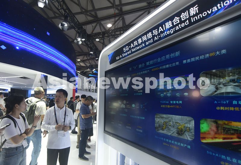 2025年6月18日,观众在上海举办的2025世界移动通信大会上了解华为的5G-A网络与AI融合应用