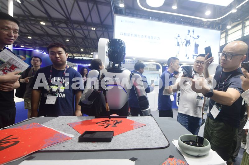 2025年6月18日,观众在上海举办的2025世界移动通信大会上观看智元人形机器人书写“福”字。