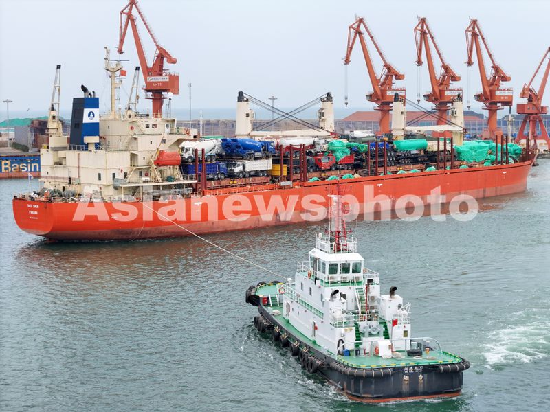 图片说明:2025年6月18日,在山东港口烟台港蓬莱港区,装载着国产工程车辆的货轮起航驶往拉美。