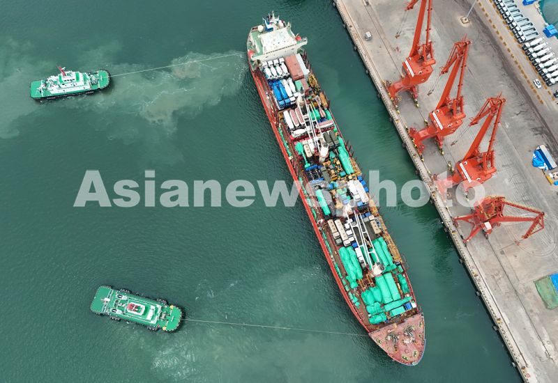 图片说明:2025年6月18日,在山东港口烟台港蓬莱港区,装载着国产工程车辆的货轮起航驶往拉美。