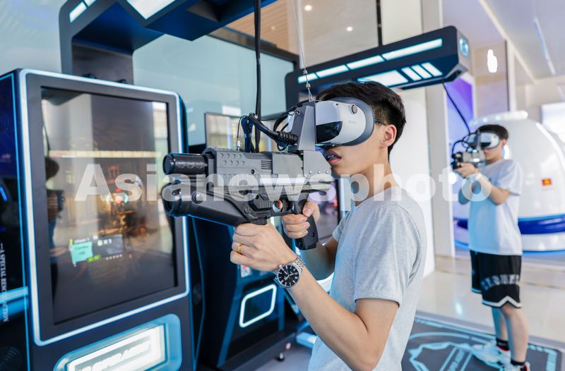 2025年6月20日,游人在内蒙古数字文旅新天地佩戴VR设备沉浸式体验《超能战士》。