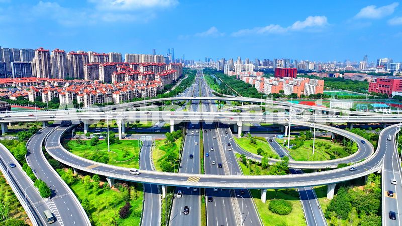 图片说明:2025年6月26日,江西省南昌市红谷滩区前湖立交桥上车辆往来疾驰,公路沿线高楼林立、树木葱郁。