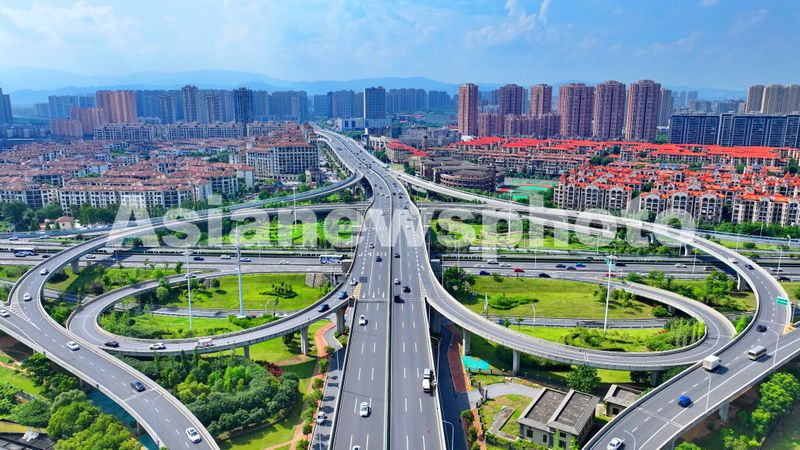 图片说明:2025年6月26日,江西省南昌市红谷滩区前湖立交桥上车辆往来疾驰,公路沿线高楼林立、树木葱郁。