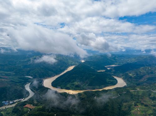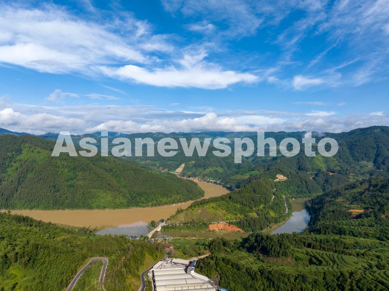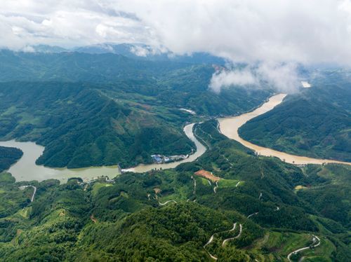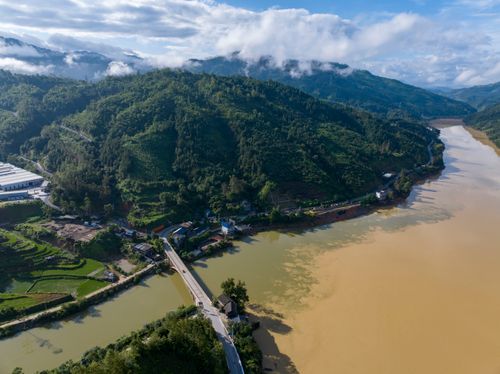 图片说明:2025年7月2日,珠江上游都柳江贵州省从江县四寨河口段出现“泾渭分明”自然景观(无人机照片)。