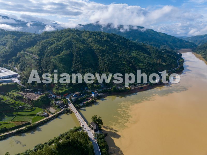 图片说明:2025年7月2日,珠江上游都柳江贵州省从江县四寨河口段出现“泾渭分明”自然景观(无人机照片)。