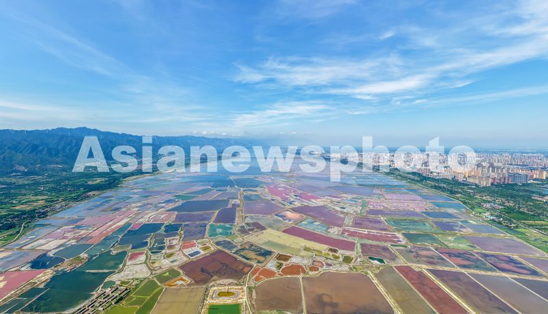 仲夏时节,随着气温的升高,山西省运城市盐湖呈现出色彩斑斓的绚丽景色,构成一幅生态美景图。