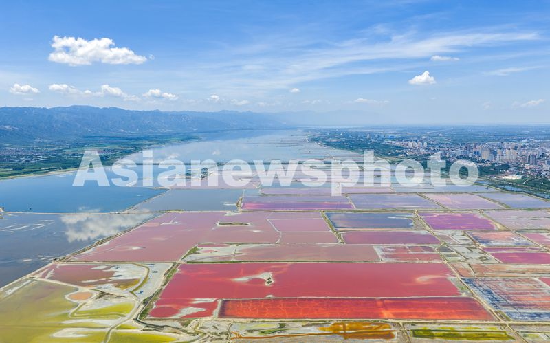 仲夏时节,随着气温的升高,山西省运城市盐湖呈现出色彩斑斓的绚丽景色,构成一幅生态美景图。
