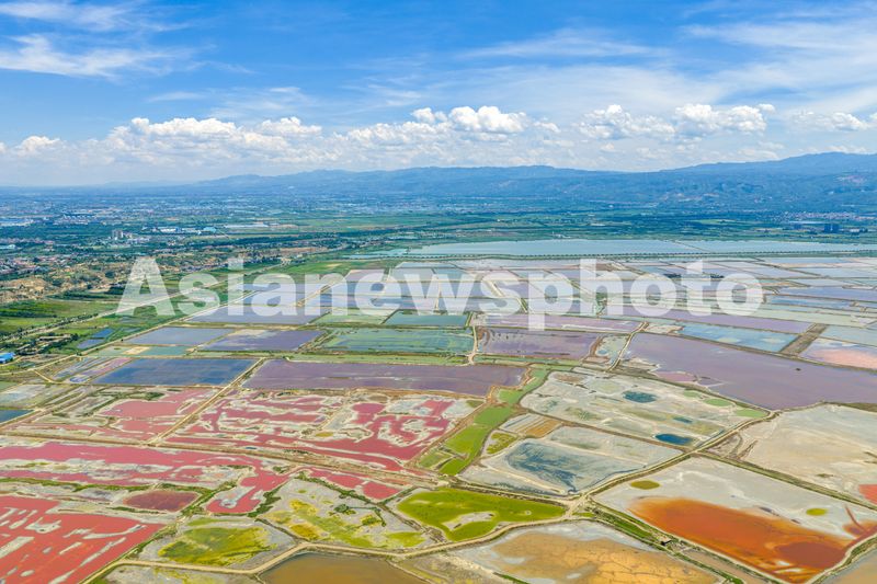 仲夏时节,随着气温的升高,山西省运城市盐湖呈现出色彩斑斓的绚丽景色,构成一幅生态美景图。