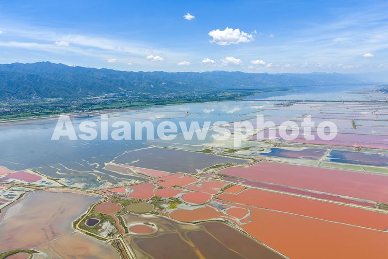 仲夏时节,随着气温的升高,山西省运城市盐湖呈现出色彩斑斓的绚丽景色,构成一幅生态美景图。
