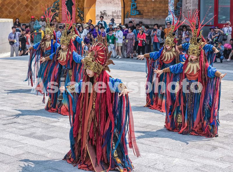 2025年7月6日,韩国游客在山东省荣成市成山头风景区观看大型古装实景演艺《东寻·成山赋》。