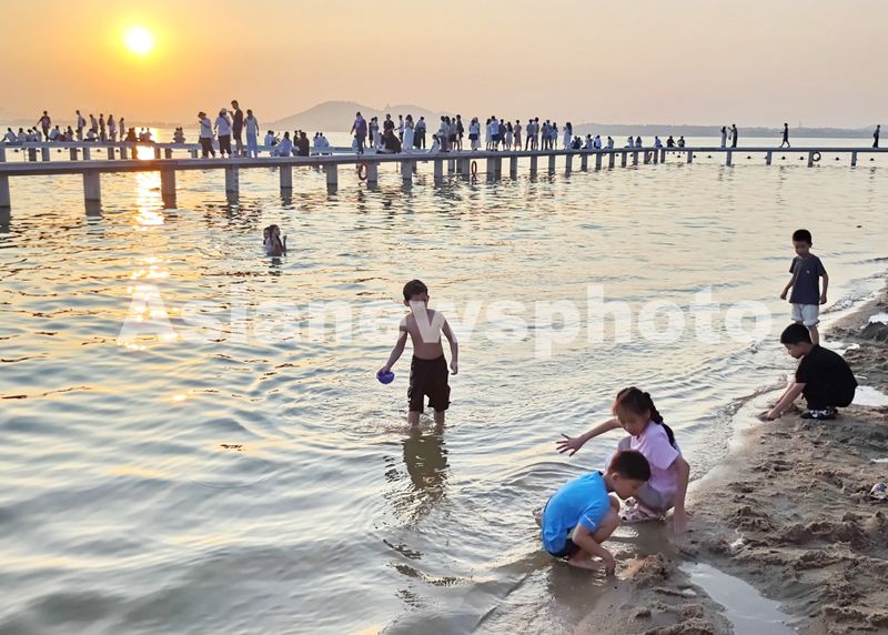 图片说明:7月6日凌晨至一大早,湖北省武汉市民和外地游客,不约而同在东湖凌波门,观日出,赏湖景,迎小暑。