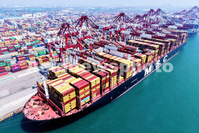图片说明:2025年7月5日,山东港口青岛港,货轮在装卸外贸集装箱。