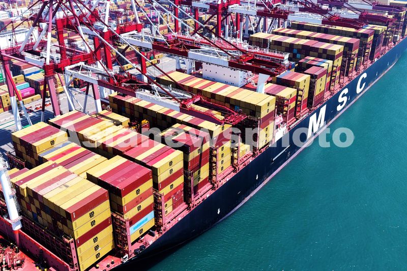 图片说明:2025年7月5日,山东港口青岛港,货轮在装卸外贸集装箱。