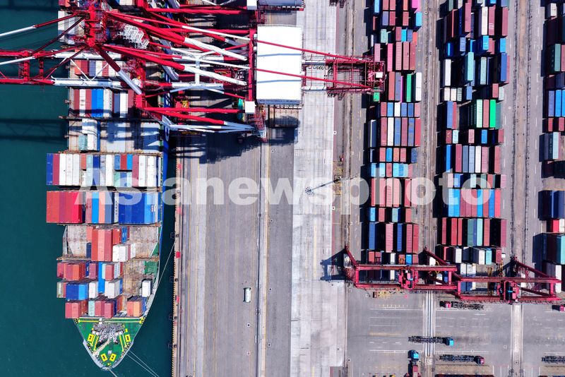 图片说明:2025年7月5日,山东港口青岛港,货轮在装卸外贸集装箱。
