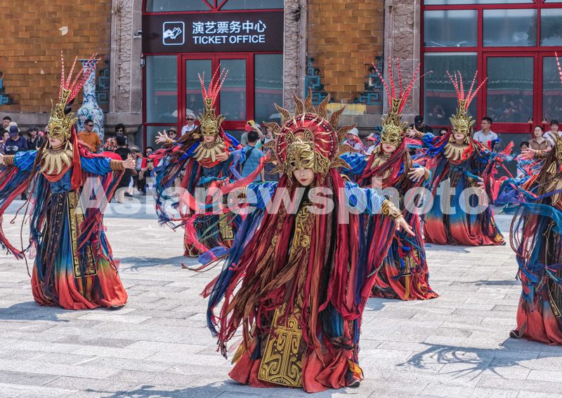 2025年7月6日,韩国游客在山东省荣成市成山头风景区观看大型古装实景演艺《东寻·成山赋》。