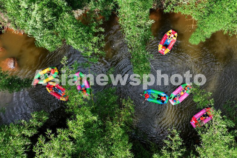 2025年7月6日,游客在四川省泸州市纳溪区大渡口镇清溪河漂流戏水游玩,乐享夏日清凉。