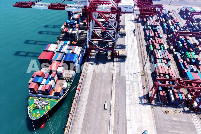 图片说明:2025年7月5日,山东港口青岛港,货轮在装卸外贸集装箱。