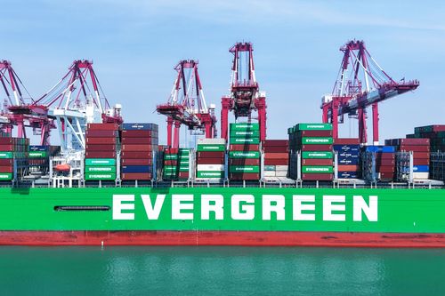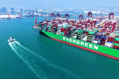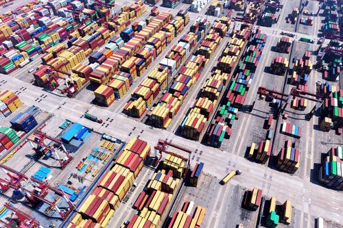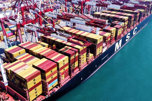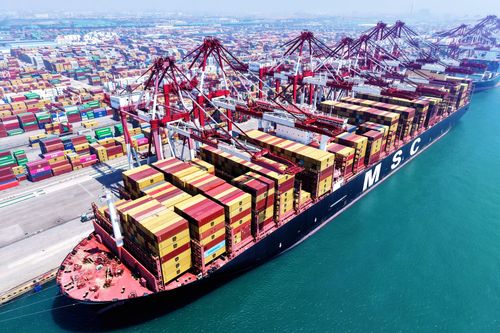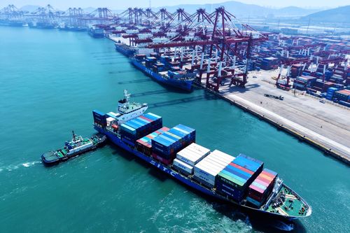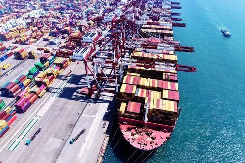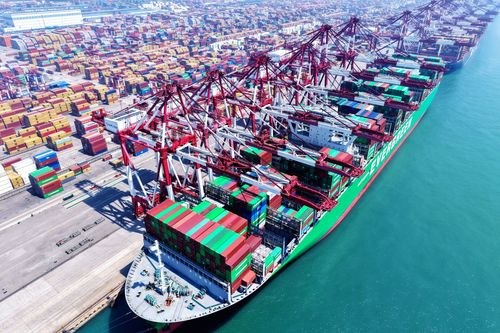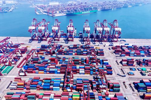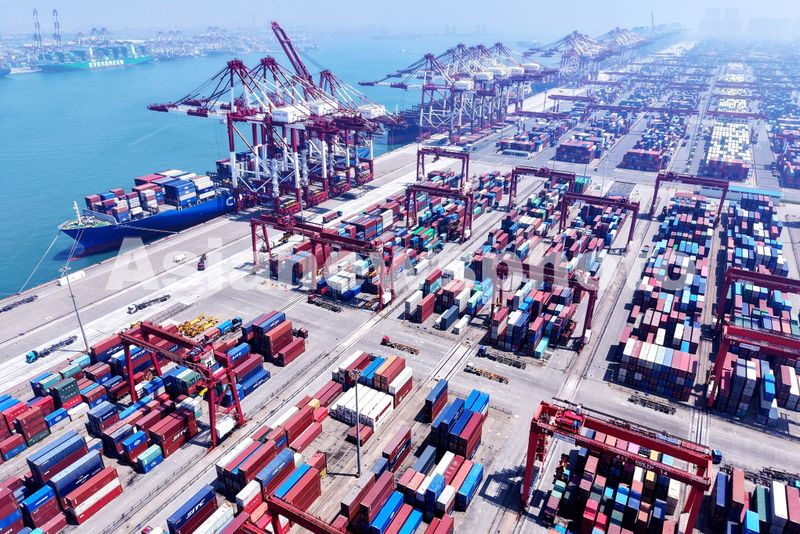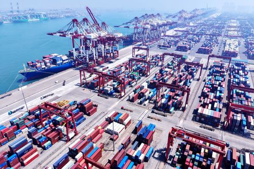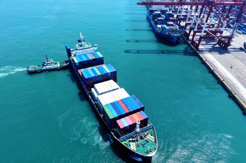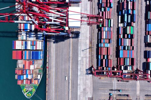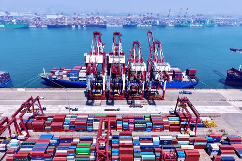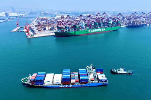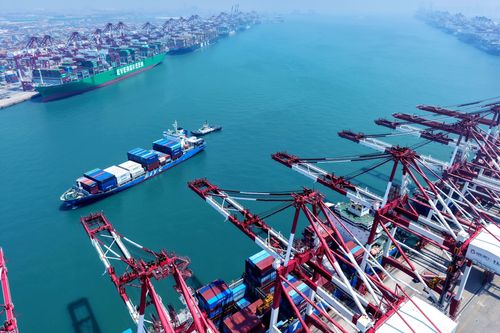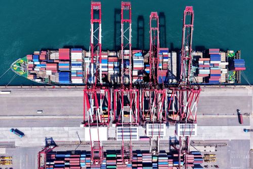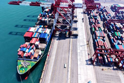 图片说明:2025年7月5日,山东港口青岛港,货轮在装卸外贸集装箱。