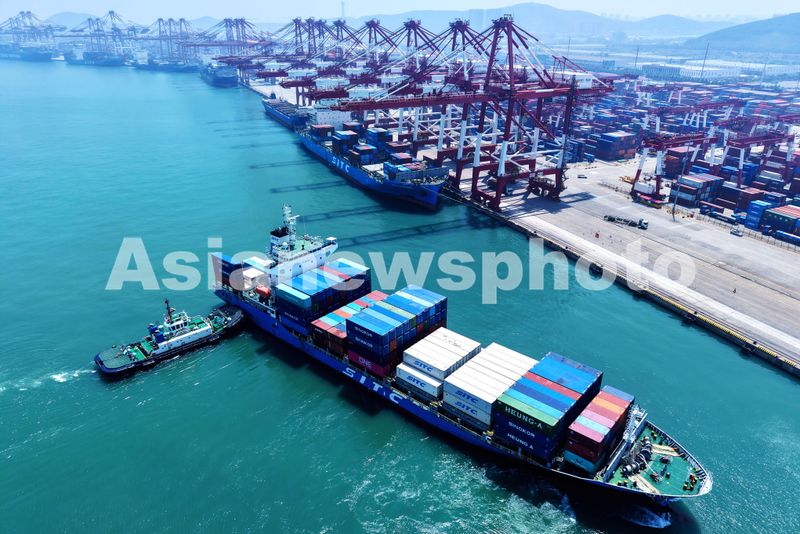 图片说明:2025年7月5日,山东港口青岛港,一艘装载外贸集装箱的货轮在停靠泊位。