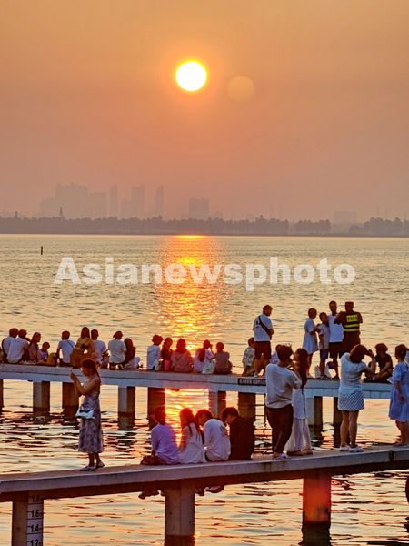 图片说明:7月6日凌晨至一大早,湖北省武汉市民和外地游客,不约而同在东湖凌波门,观日出,赏湖景,迎小暑。