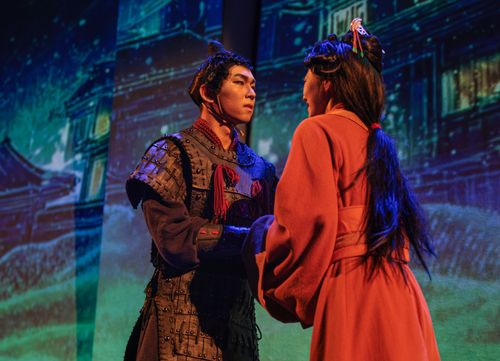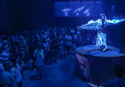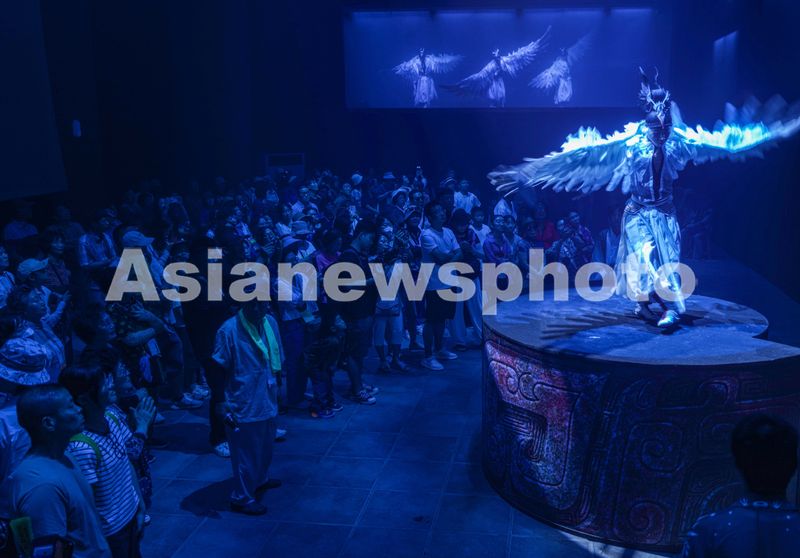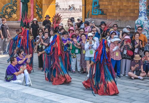 2025年7月6日,韩国游客在山东省荣成市成山头风景区观看大型古装实景演艺《东寻·成山赋》。
