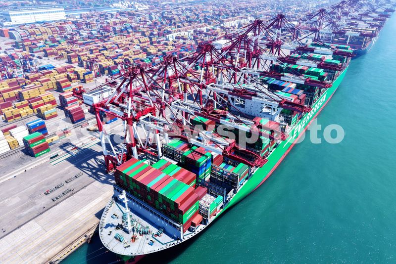 图片说明:2025年7月5日,山东港口青岛港,货轮在装卸外贸集装箱。