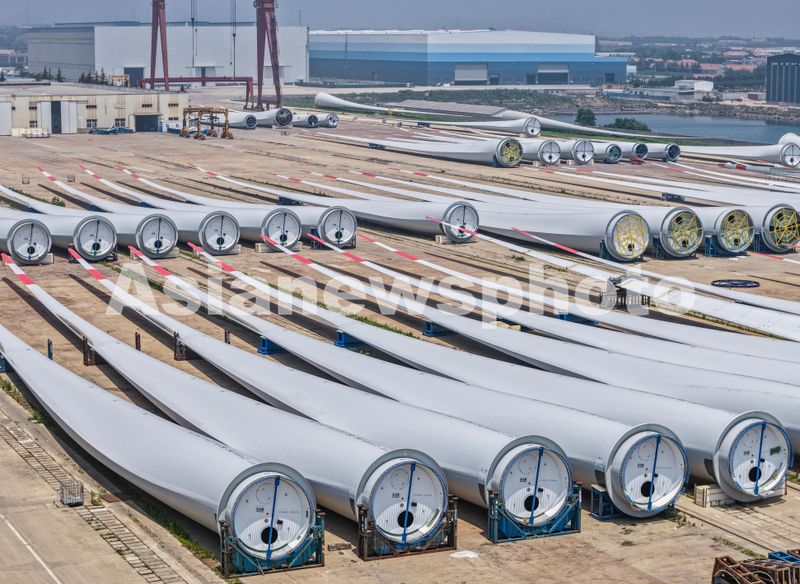 2025年7月10日,山东省荣成市石岛管理区的海上风电产业基地,近百套超大型风电叶片整齐排列,等待着吊装和运输。
