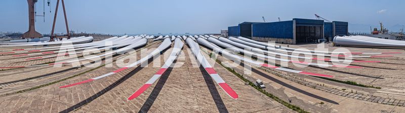 2025年7月10日,山东省荣成市石岛管理区的海上风电产业基地,近百套超大型风电叶片整齐排列,等待着吊装和运输。