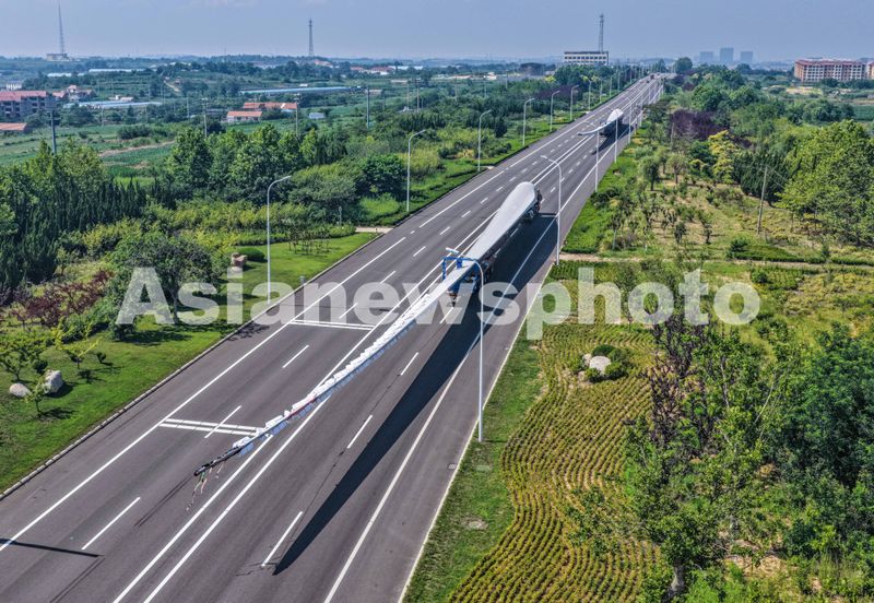 2025年7月10日,山东省荣成市石岛管理区,超大型风电叶片通过陆运发往作业区进行安装。