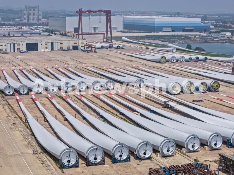 2025年7月10日,山东省荣成市石岛管理区的海上风电产业基地,近百套超大型风电叶片整齐排列,等待着吊装和运输。