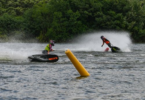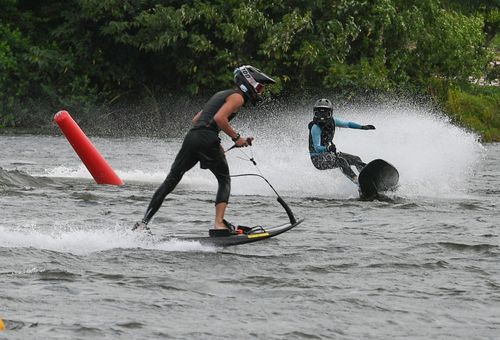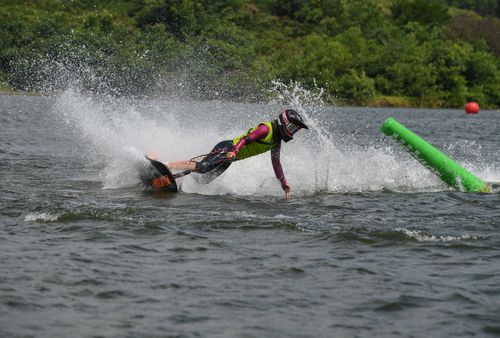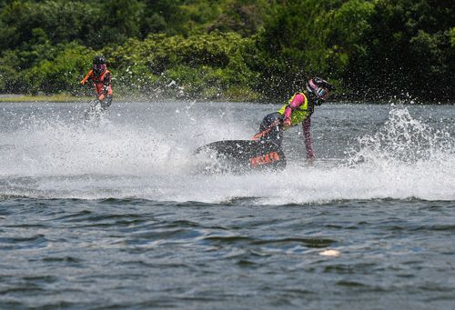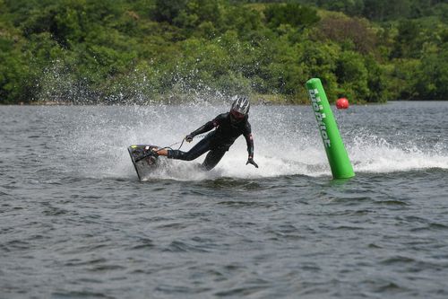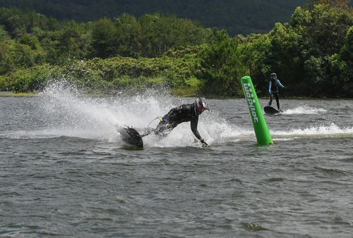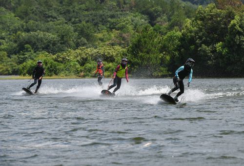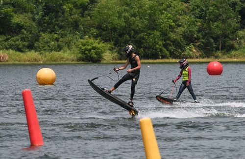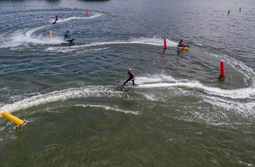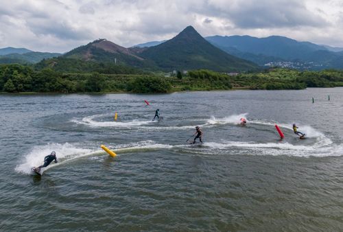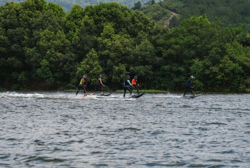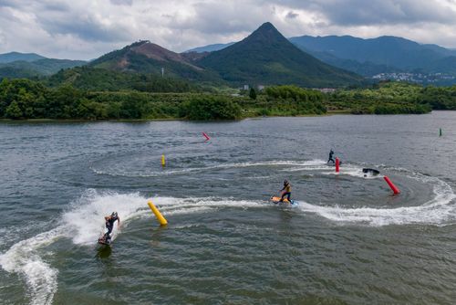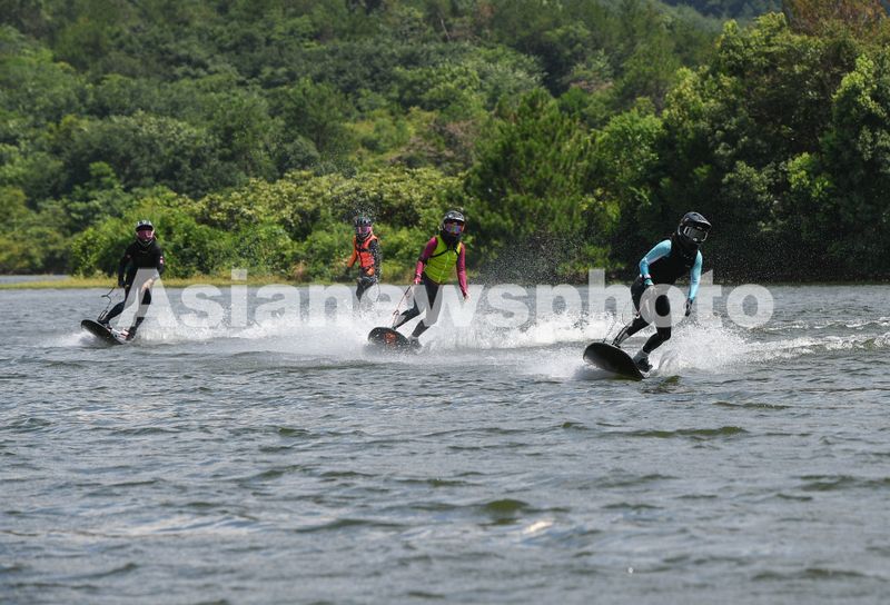 2025年7月10日,浙江省金华市婺城区长岭水库,国家动力冲浪板集训队运动员在训练中,备战2025年第12届世界运动会比赛。