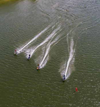 2025年7月10日,在浙江省金华市婺城区长岭水库,国家动力冲浪板集训队运动员们在水面上刻苦训练,备战2025年第12届世界运动会动力冲浪板比赛。