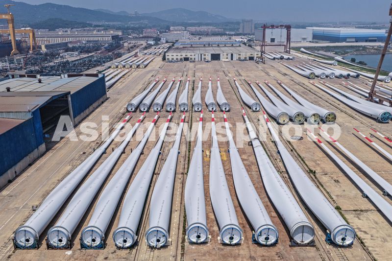 2025年7月10日,山东省荣成市石岛管理区的海上风电产业基地,近百套超大型风电叶片整齐排列,等待着吊装和运输。