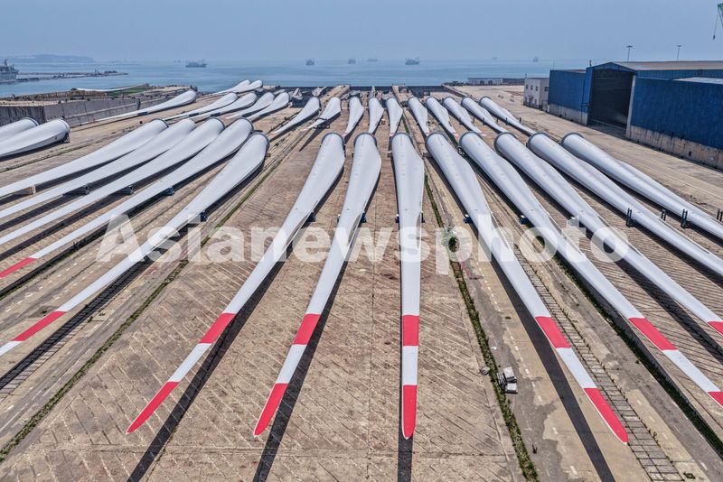 2025年7月10日,山东省荣成市石岛管理区的海上风电产业基地,近百套超大型风电叶片整齐排列,等待着吊装和运输。