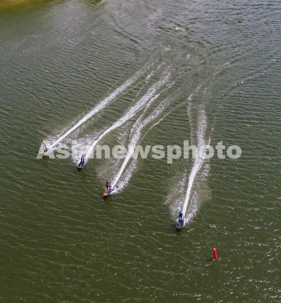 2025年7月10日,浙江省金华市婺城区长岭水库,国家动力冲浪板集训队运动员在训练中,备战2025年第12届世界运动会比赛。