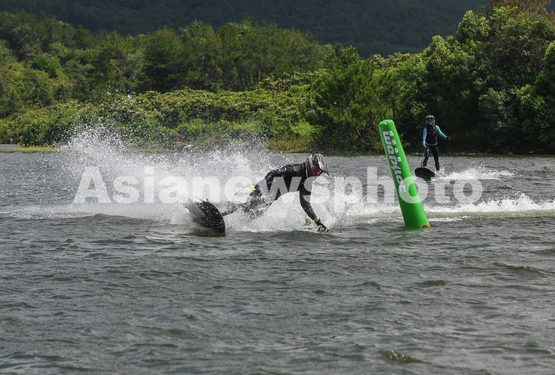 2025年7月10日,浙江省金华市婺城区长岭水库,国家动力冲浪板集训队运动员在训练中,备战2025年第12届世界运动会比赛。